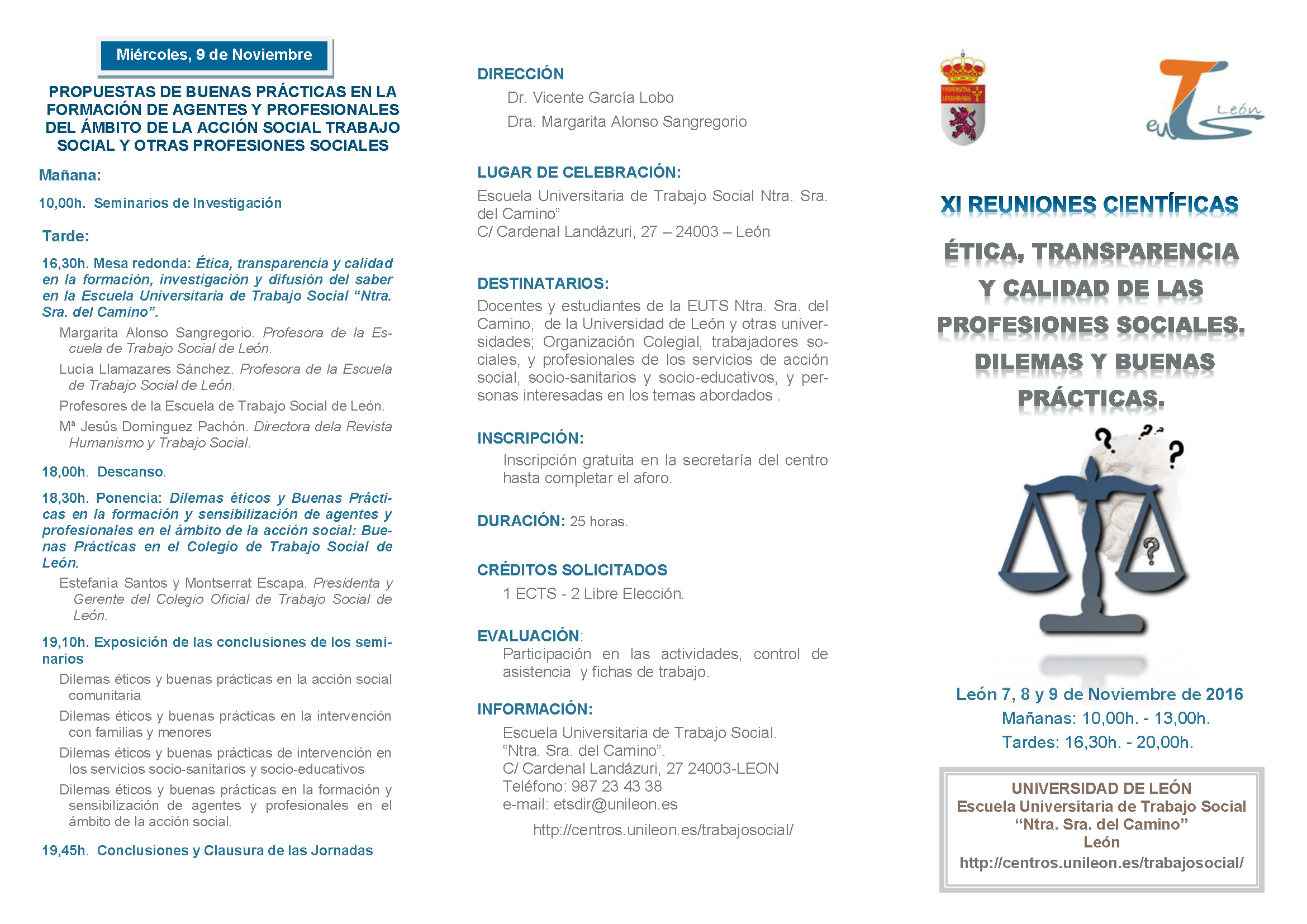 Xi Reunion cientifica «Ética, transparencia y calidad de las profesiones sociales. Dilemas y buenas prácticas». León, Escuela Universitaria de Trabajo Social “Nuestra Señora del Camino”, 7, 8 y 9 de Noviembre de 2016.